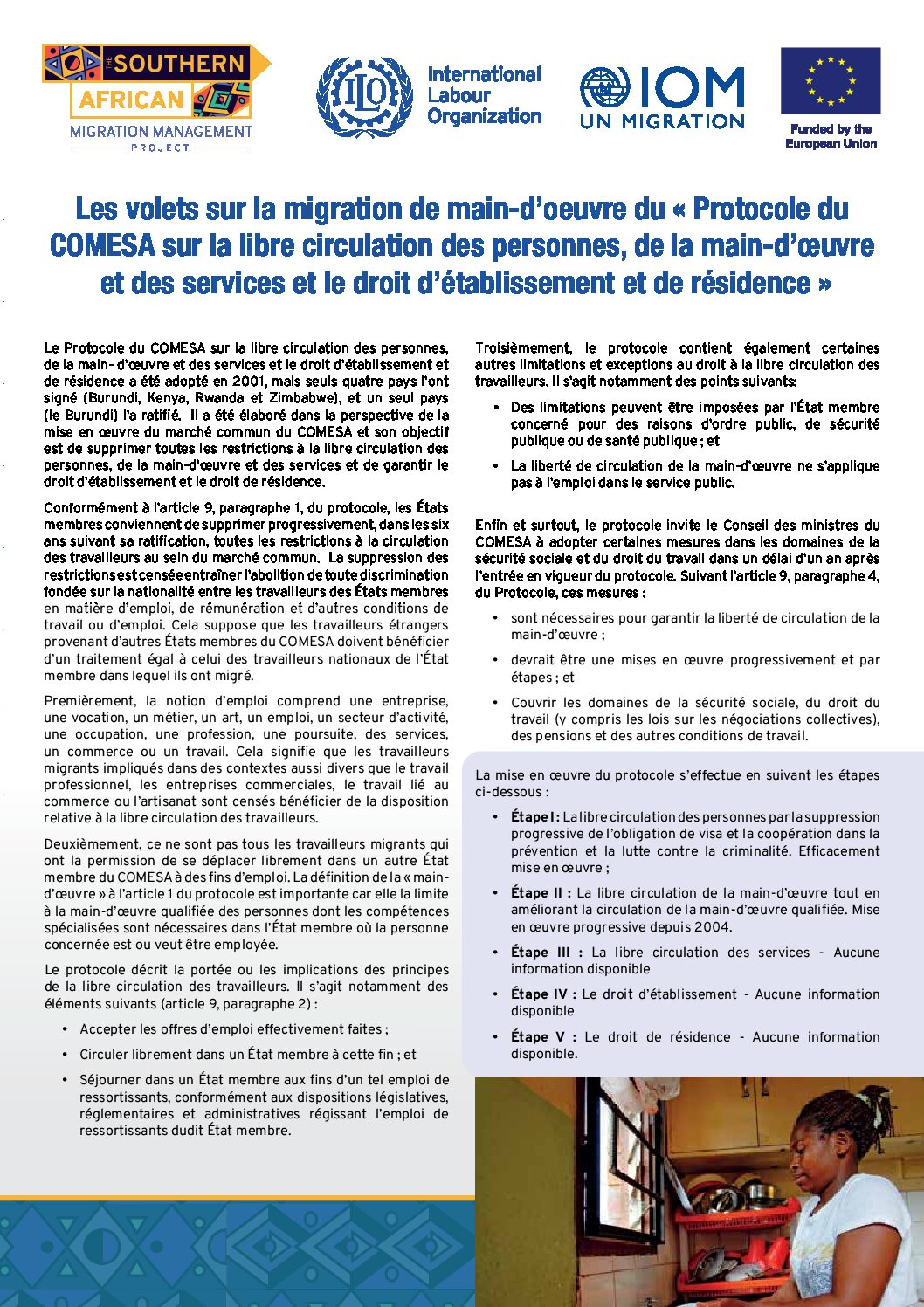 Le protocole sur la libre circulation a été adopté en 2001 par l’autorité des chefs d’État et de gouvernement du COMESA et est en cours de signature et de ratification. Le protocole sur la libre circulation a été élaboré pour faciliter la mise en œuvre du marché commun du COMESA, dans le but de supprimer toutes les restrictions à la libre circulation des personnes, de la main-d’œuvre et des services et de prévoir le droit d’établissement et le droit de résidence. À ce jour, peu de progrès ont été réalisés en ce qui concerne la signature et la ratification du protocole, et seuls quatre des 19 États membres du COMESA l’ont signé.